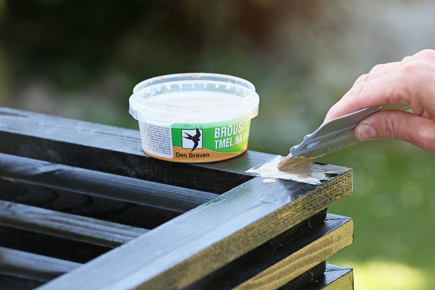 Poslední latě připevníme lepidlem a vruty. Šrouby zahloubíme, překryjeme tmelem a vyplníme i vnitřní rohy. Po zaschnutí povrch obrousíme a přetřeme lazurou.