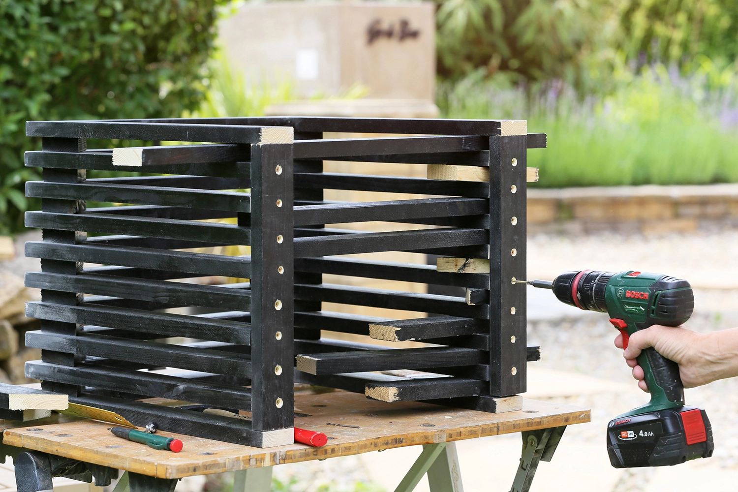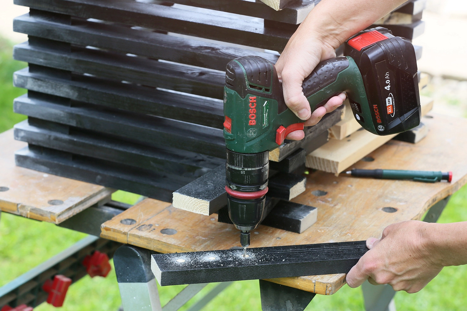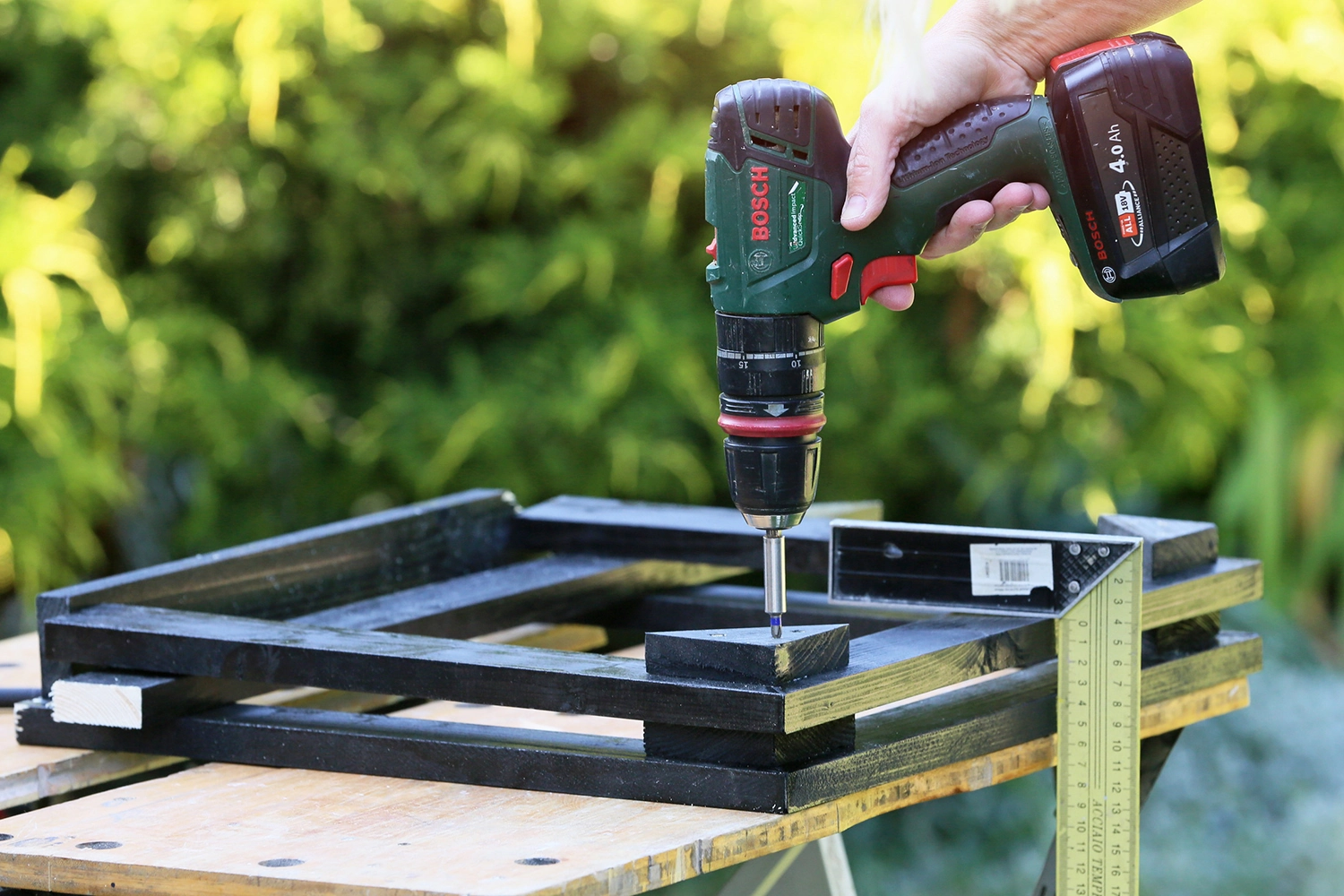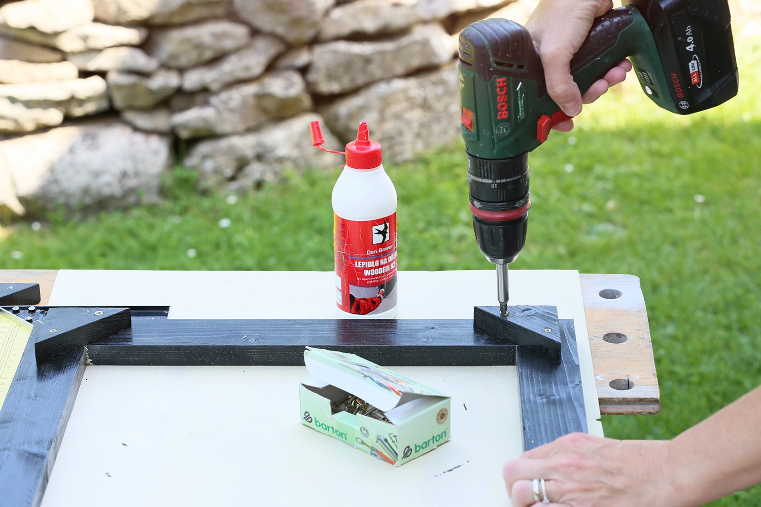 Do trojúhelníků vyvrtáme dvě dírky, natřeme je lepidlem a připevníme do vnitřních rohů pomocí vrutů (cca 35 mm). Vznikne devět stejných modulů.