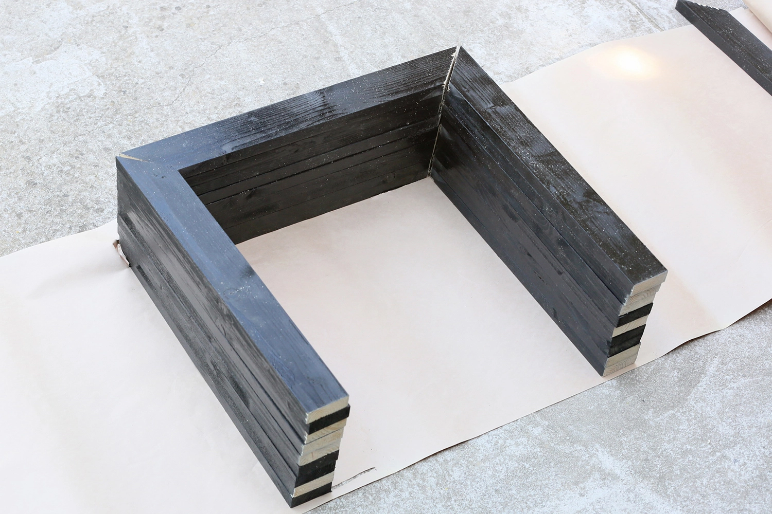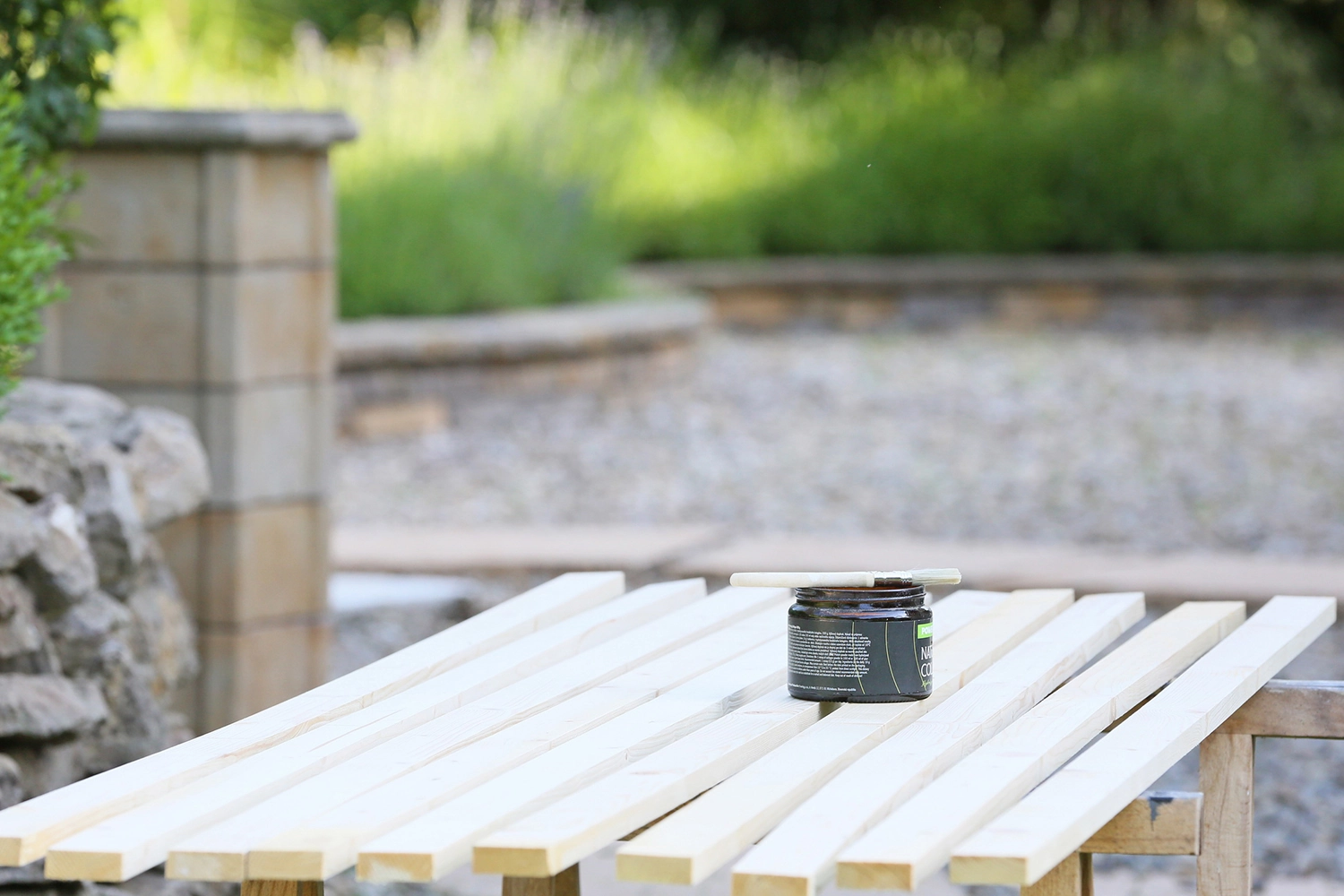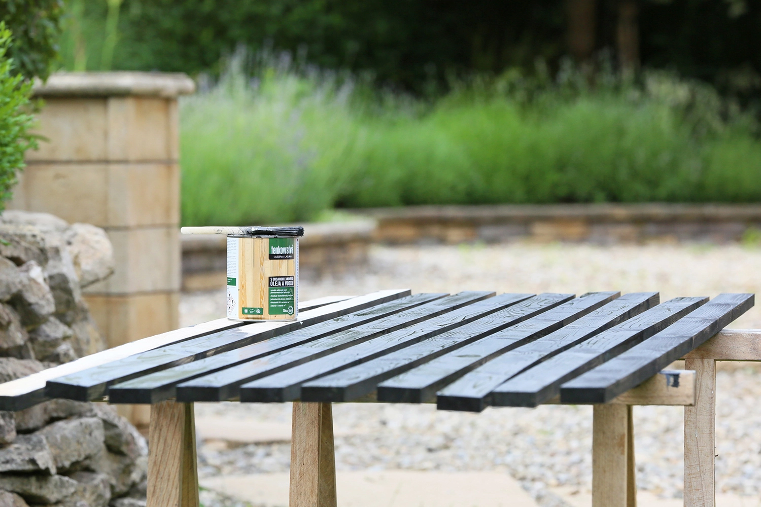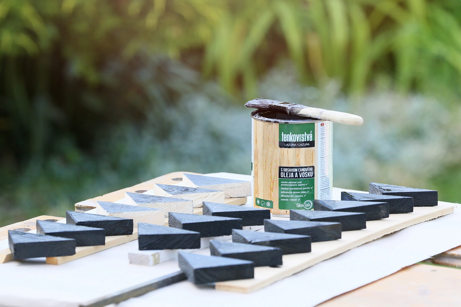 Po zaschnutí naneseme dvě vrstvy černé lazury. Přebytečný olej z druhé vrstvy po asi 5 minutách setřeme bavlněnou látkou, aby povrch zůstal matný a bez nežádoucího lesku.