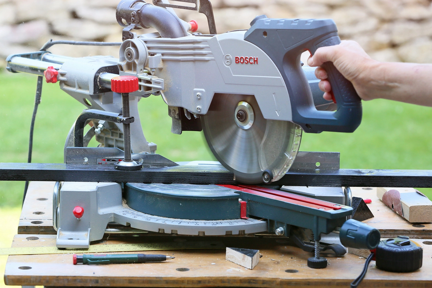 Pomocí pokosové pily nastavíme úhel 45° a připravíme jednotlivé části: