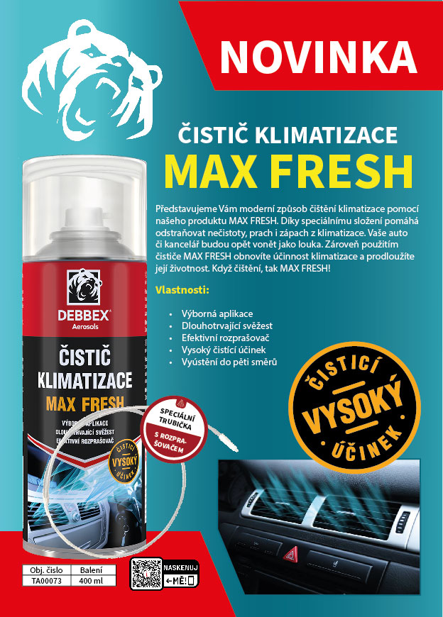 Čistič klimatizace MAX FRESH je ideální prostředek pro čištění klimatizací s dlouhotrvající svěžestí. Prostředek má efektivní rozprašovač, který pomáhá k vyšším čistícím účinkům. Používá se pro čištění klimatizací v automobilech ale i běžných ventilačních systémů.