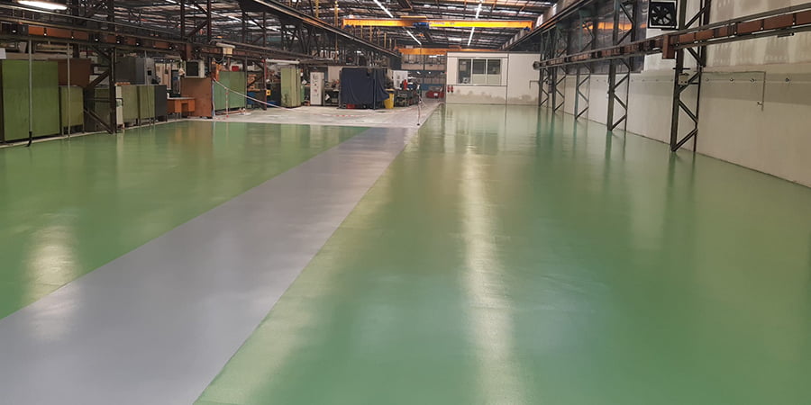 Penetrace byla provedena výrobkem EPOXIN F1000 DRY zasypaným přírodním pískem frakce 0,4 – 0,8 mm. Po zaschnutí penetrace byl přebytečný písek odstraněn a povrch se finálně přelil stěrkou EPOXIN F5000 ve spotřebě cca 2 kg/m2. Finální stěrka se použila ve dvou odstínech RAL 7001 a RAL 6021. Kombinací těchto dvou barev se plocha podlahy rozdělila na část výrobní a komunikační.