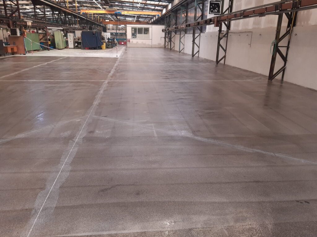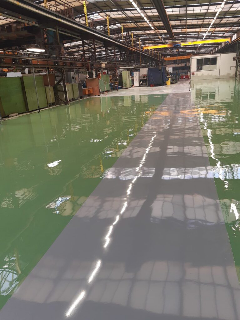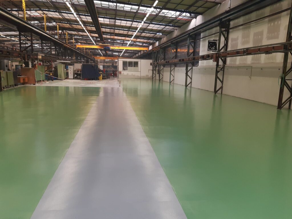 Penetrace byla provedena výrobkem EPOXIN F1000 DRY zasypaným přírodním pískem frakce 0,4 – 0,8 mm. Po zaschnutí penetrace byl přebytečný písek odstraněn a povrch se finálně přelil stěrkou EPOXIN F5000 ve spotřebě cca 2 kg/m2. Finální stěrka se použila ve dvou odstínech RAL 7001 a RAL 6021. Kombinací těchto dvou barev se plocha podlahy rozdělila na část výrobní a komunikační.