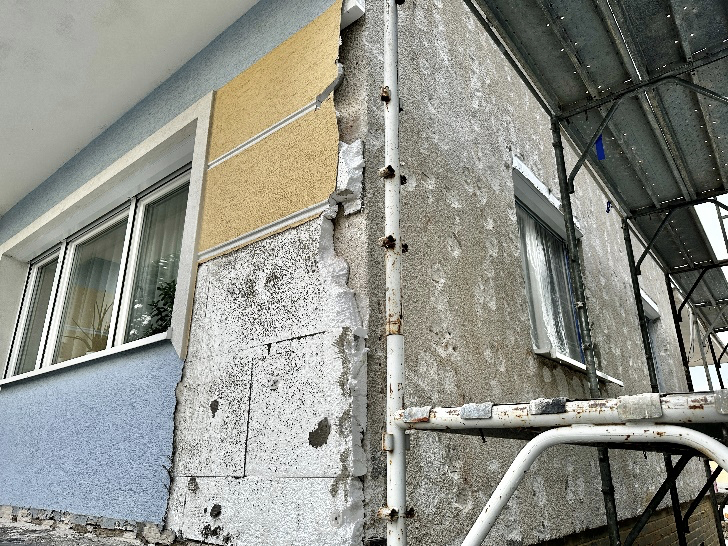 Nejprve bylo odstraněno původní zateplení, následovalo lepení nového zateplení – šedého polystyrenu o tloušťce 18 cm. Polystyren byl upevněn kombinací lepidla QUARTZ FASÁDA a stěrkového tmelu a lepidla THERMO KLEBER, což zajistí pevnou a trvanlivou přilnavost.