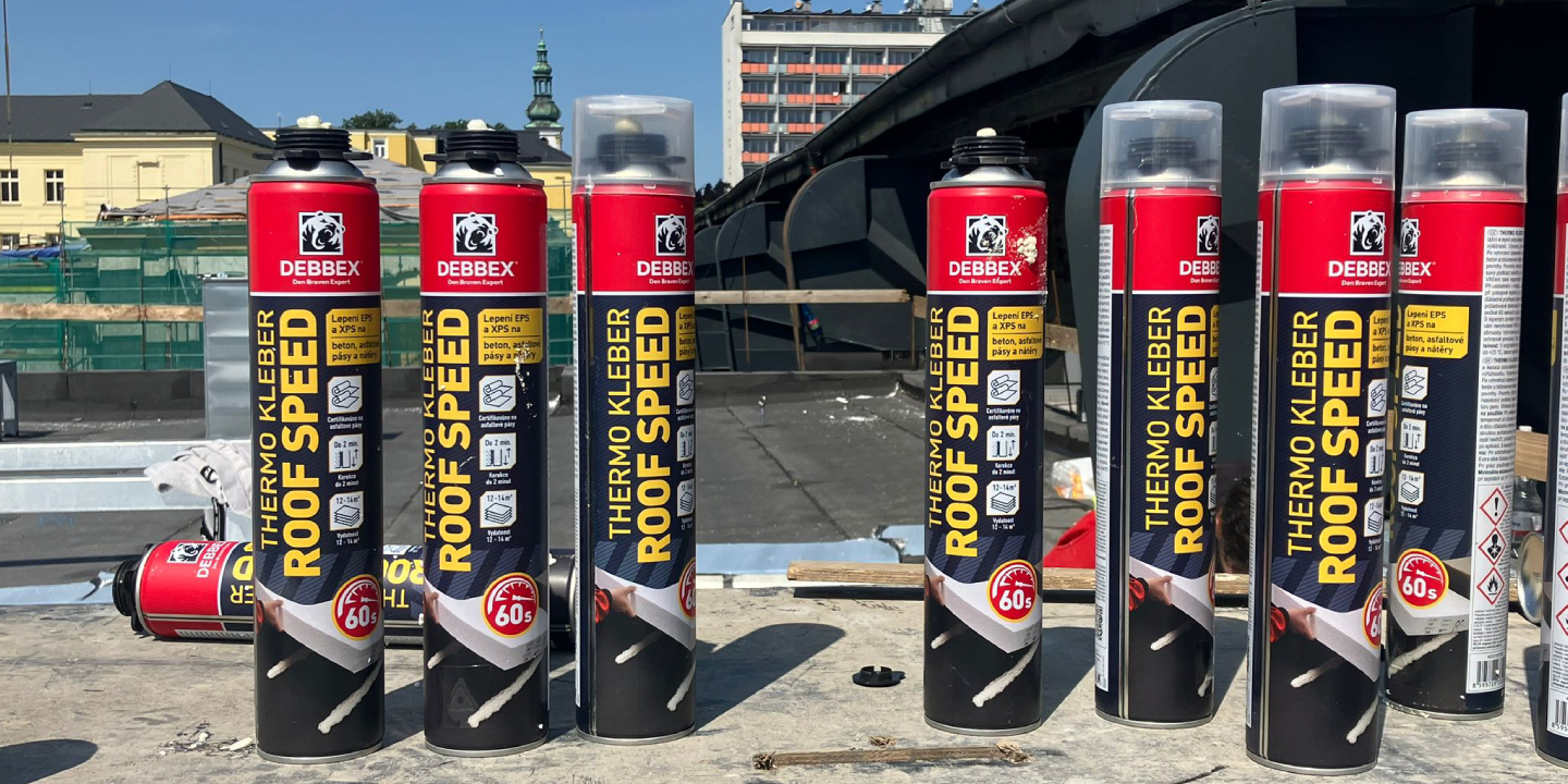 Naše společnost dodala realizační firmě rychleschnoucí polyuretanové lepidlo THERMO KLEBER ROOF SPEED, které se osvědčilo jako ideální materiál pro lepení izolačních desek. Tento produkt je určen pro lepení EPS a XPS desek na asfaltové pásy, beton či bitumenové nátěry.