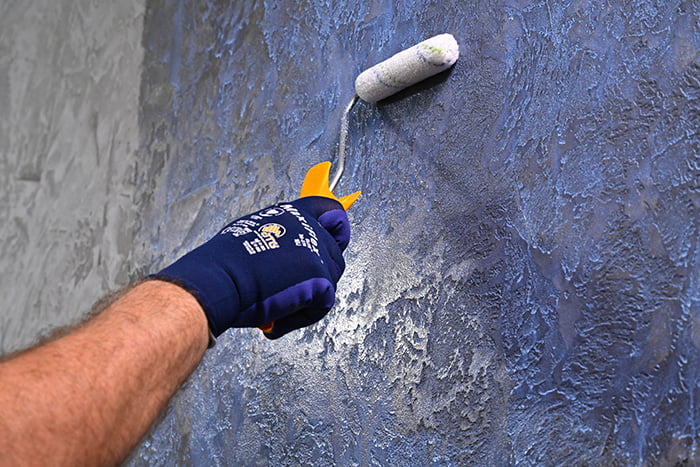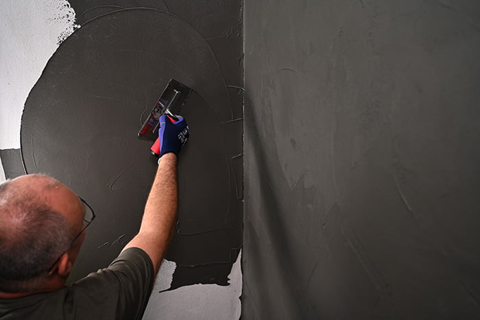 Naneste druhou vrstvu pomocí dekorativních technik, jako je „roztahování“ nebo „rozetírání“. Vytvořte nepravidelný reliéf připomínající beton. Po krátkém zaschnutí hmoty (15 až 30 minut) lze povrch dodatečně vyhladit.