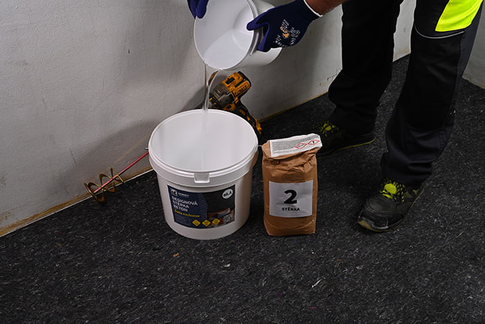 Do kbelíku z obalu nalijte 900 ml vody a nasypte 2,5 kg suché složky „Označené 2 – dekorativní stěrka”. (360 ml vody na 1 kg směsi). Hmotu důkladně promíchejte, nechte 5 minut odstát a poté znovu promíchejte.